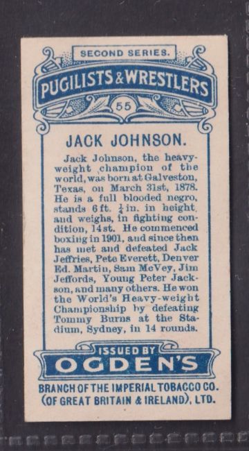 Cigarette card, Ogden's Pugilists & Wrestlers 2nd series type card number 55 Jack Johnson (vg)