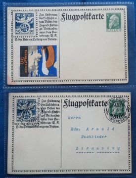 Postcards, Postal History, a scarce German air mail card (Flugpostkarte), with 'Flug Post Munchen' postmark and dated 11 Oct 1912 Luft post stamp and 5 pf stamp printed. Illustration on reverse shows flying carriage with wings, and driver blowing post horn, illustrated by W Ditz. Sold with unused similar card with scarce label 'Suddeutscher Flug 1912' (tape adhesion to front o/w gd, posted card gd)