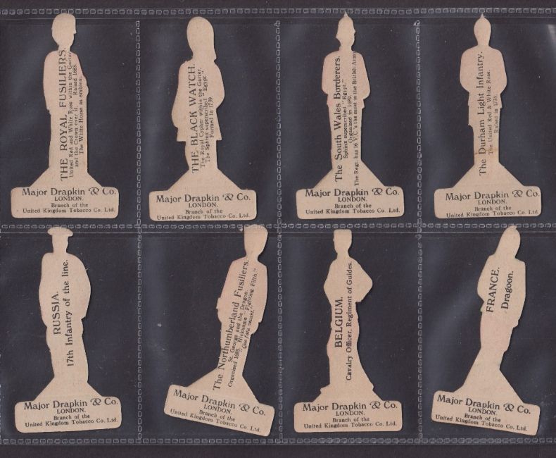 Cigarette cards, Major Drapkin, Soldiers & their Uniforms (set 25 cards). 2 cards Drapkin, 23 cards Crayol. Includes the scarcer numbers Durham , South Wales (which are both the Drapkin front) and 1st life (Crayol). (Grenadier Guards card missing head rest generally gd)