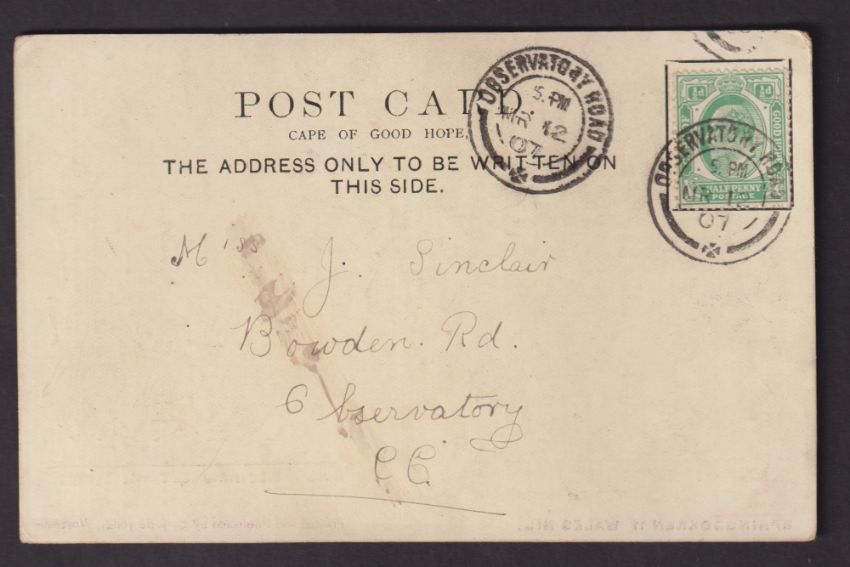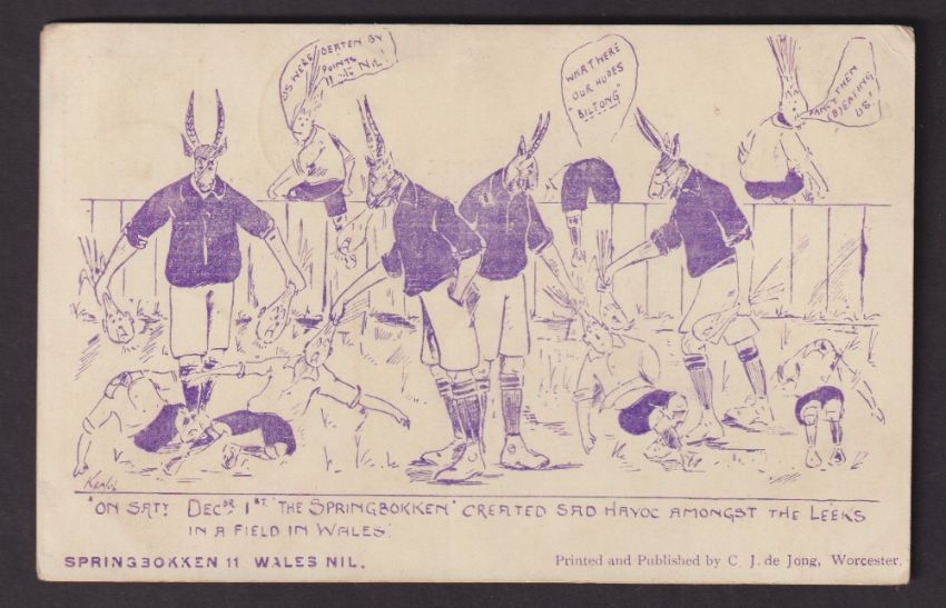 Rugby postcard, scarce 1906 Springboks comic rugby postcard, detailing the score after beating Wales 11-0, artist drawn showing the Springboks removing leek heads of Welsh players (postally used 1907, gd) (1)