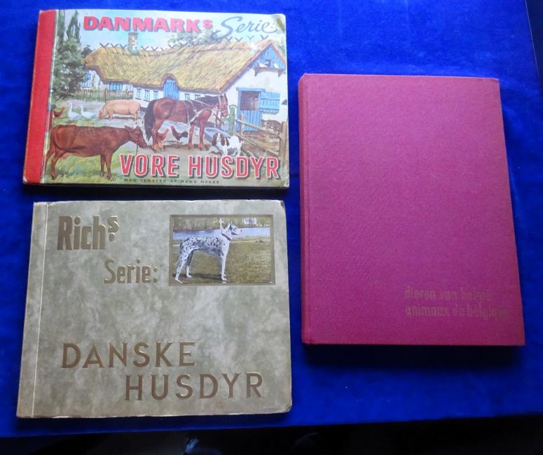 Trade cards, Overseas issues, 3 albums with cards stuck in, all complete, each one with a Domestic Animals theme. Danmark's Billede Vore Husdyr, Fort Itegem Animaux de Belgique, Rich's Serie Danske Husdyr (some wear to covers of albums, gen gd)