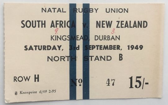 Rugby ticket, South Africa v New Zealand, 3rd Sept 1949, scarce 3rd Test match ticket for game played at Kings Park, Durban (sof, gd) (1)