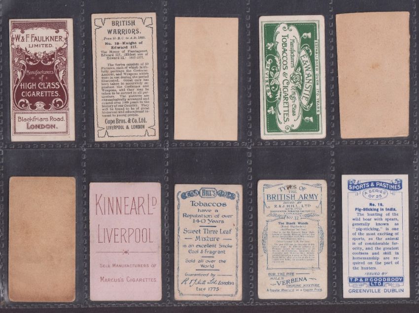 Cigarette cards, 28 scarcer cards including Hill Colonial Troops (3), Marsuma Golf (2). Plus many other issuers including Hudden, Pritchard Burton, Salmon Gluckstein, Taddy, Kinnear, Cope, Faulkner, Charlesworth & Austin, Smith etc (gen fair a few near gd)