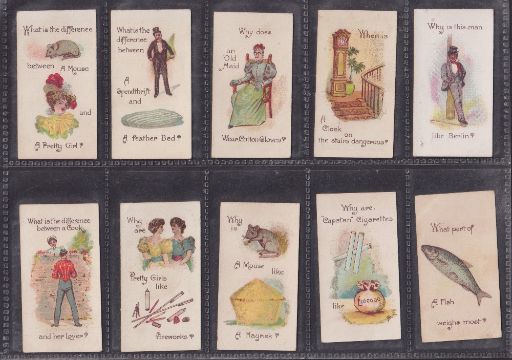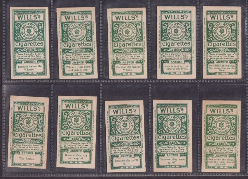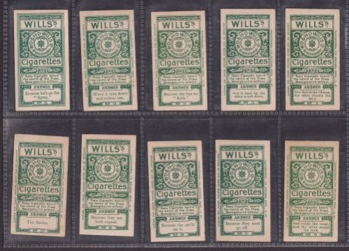 Cigarette cards, Will's, Conundrums (set 25 cards), mixed backs, 19 with and 6 without album clause (1 card back damage - 'Why Ought Ireland…' otherwise some printed on cream / brown card most on white / light cream card, gen gd)