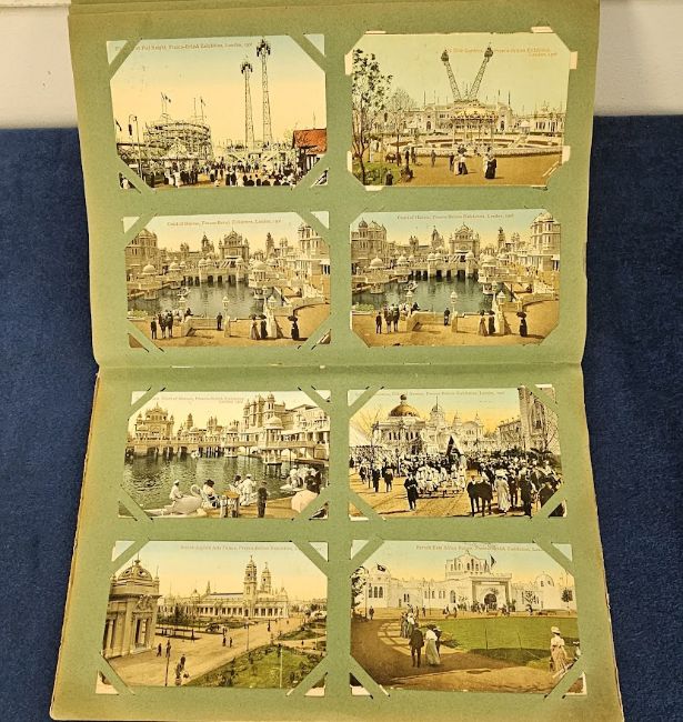 Postcards, Exhibitions, a collection in vintage album of approx. 200 cards of exhibitions, mainly Franco British, with a few Festival of the Empire. Includes buildings, Ballymaclinton, commemoratives, rides, stadia, giant cards, Ceylon village, elephants, dancing bear, Hagenbeck's, comic, conundrums, Shepherd's Bush exhibition, views at the glass furnace, stands and industries (Fry's, Godfrey Phillips, Spratts, Thorley's, Moet, Martell, Perrier, Cointreau) etc (mixed condition)