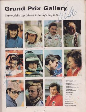 Motor Racing autographs, British Grand Prix, Brands Hatch, 18 July 1970. Official programme from the event with multiple signatures to the Portrait Gallery pages showing pictures of the World's top drivers. Signatures include Jack Brabham, Denny Hulme, Mario Andrette, Jackie Oliver, Jo Stiffert, Ronnie Peterson, John Surtees etc. (centre pages detached o/w gd)