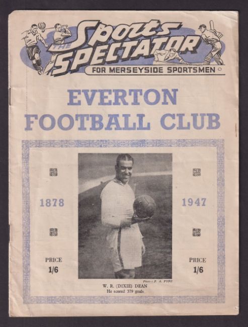 Everton FC, Football magazine, 'The Sports Spectator for Merseyside Sportsmen', Everton Football Club 1878-1947, 12 page magazine with history of the club, team group pictures, FA Cup record etc. Image of Dixie Dean to front cover (some light creasing, gd) (1) From the Phil Martin Collection.
