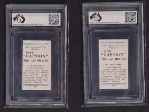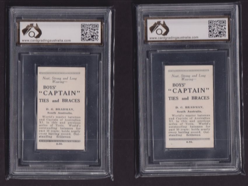 Trade cards, Cricket, Boy's Captain Australian Cricketers, 2 cards both Donald Bradman subjects from the set, both professionally graded by CGA. Head & Shoulders Portrait card graded 5 (Ex) and Action Portrait card graded 6 (Ex+)