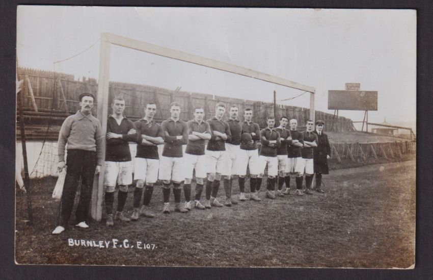 Football postcard, Burnley FC, a photographic postcard showing the Burnley team lined up in goalmouth with ref no. E107, early 1900's, list of players identified on separate sheet of paper (slight creasing, unused) (1)
