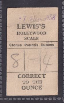 Trade card, Lewis's, Hollywood Scale card (Weighing machine card), Footballer, M Busby of Liverpool FC, date stamped to back 7 April 1938 (creased) (1)