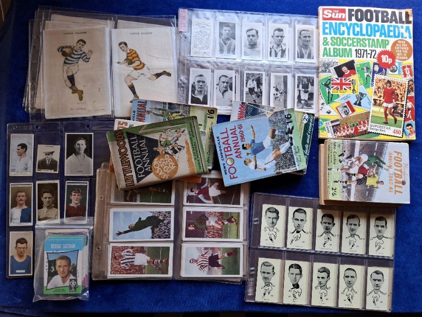 Cigarette & Trade cards & Ephemera, Football selection including BDV P size silk league colours (5), Various odd cards including Churchman Football Club Colures etc, Chix Famous Footballers 2nd (set 48 cards), J Sinclair, 2 sets English & Scottish Football Stars, Well Known Footballers Scottish, 25 A & BC including 17 Star Player series, Sun Football Encyclopaedia Stamp Album 1971-72 approx. 90% complete, 6 small football books News Chronicle (2) 1959/60, 1960/61, Playfair 1962/63, Football Album 1961/62, Littlewoods (2), 1935/36, 1936/37 (cards gen gd/ better, some wear to football books)