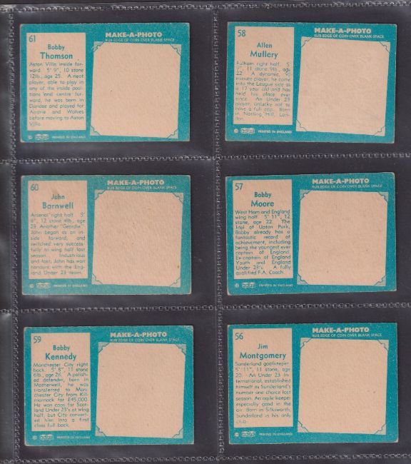 Trade cards, Football, A&BC Gum, 1963 Footballers Make a Photo sky blue backs, 2nd series 56-110 (set 55 cards) includes Bobby Moore, Denis Law etc (checklist unmarked but pink gum stain on back, otherwise gen gd a few vg)