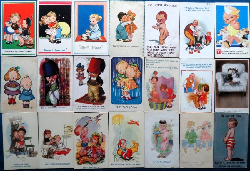 Postcards, Children, a mix of approx. 140 artist drawn cards of children and comic. Artists include McGill, Trow, Graeff, Dinah, Paterson, Gilson, Tempest, Ludgate, Spurgin, Comicus, Noble etc. Themes include dogs, tin bath, post-box, cart, military, babies, seaside, bagpipes, motorcars, teddy, bedtime, hammock, tea, romance etc (mixed condition)