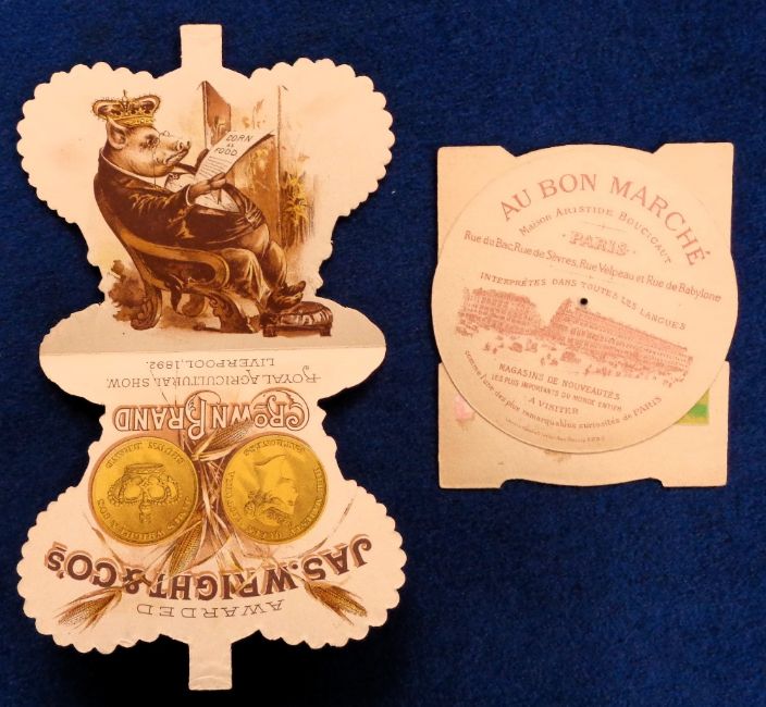 Advertising Cards, 23 early advertising items to include Au Bon Marche (mechanical), The Globe Lawn Mower, Fowler Bros stock yards (die cut crown with anthropomorphic pig shown inside), Stevens's New Silk Edged Perfumed Cards folder with fringed card inside etc. includes 6 die cut examples (gd)