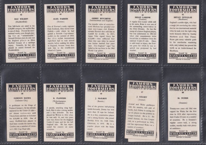 Trade cards, Barratt Famous Footballers A10 (set 50 cards) including Gordon Banks (vg)