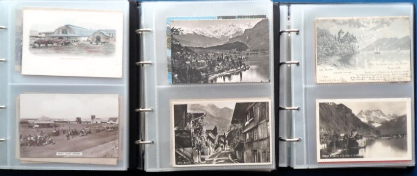 Postcards, Foreign, a collection of approx. 230 cards in 3 modern albums, mostly Swiss with a few Gruss Aus, street scenes and views inc. Luzern floods (many), ice cutting in Davos etc. Also a few South Africa mostly Johannesburg markets, illustrated big game animals and birds and flowers (mainly gd)