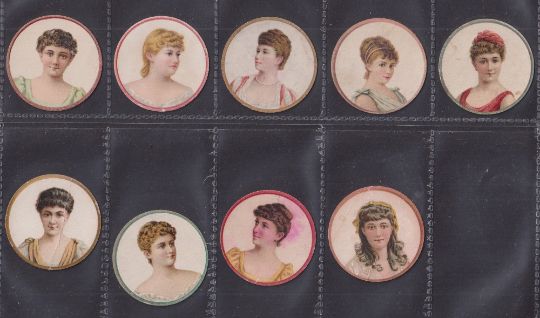 Cigarette cards, USA, Selection of 60 cards, all Actress and Beauties related Kinney Beauties Circular, blue back (8), red back (9), Kinney Novelties (shaped, 5 cards), ATC Songs A (2), Songs B (7), Songs C (17), Songs D (9), Songs E (3) (mixed condition gen fair/gd)