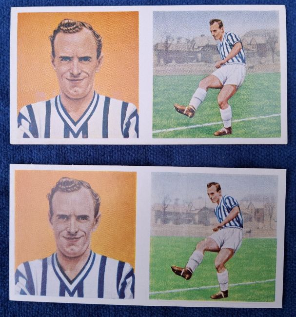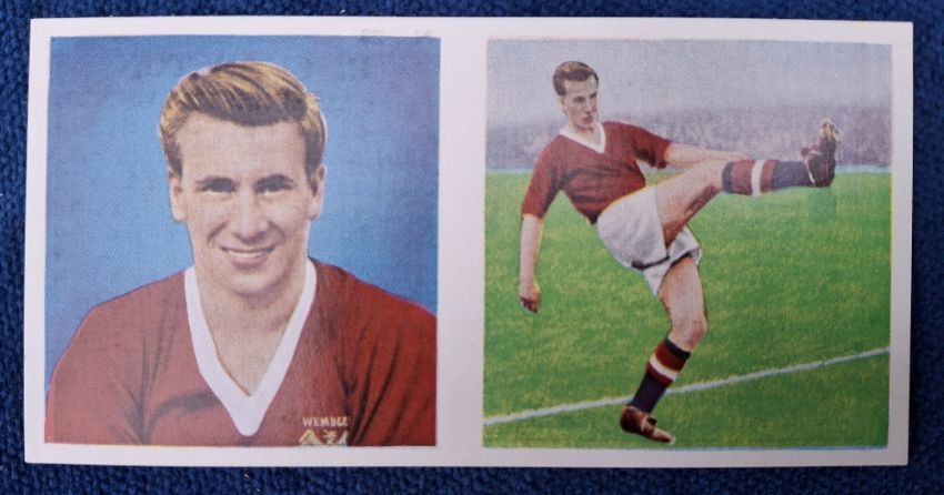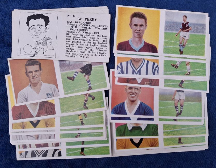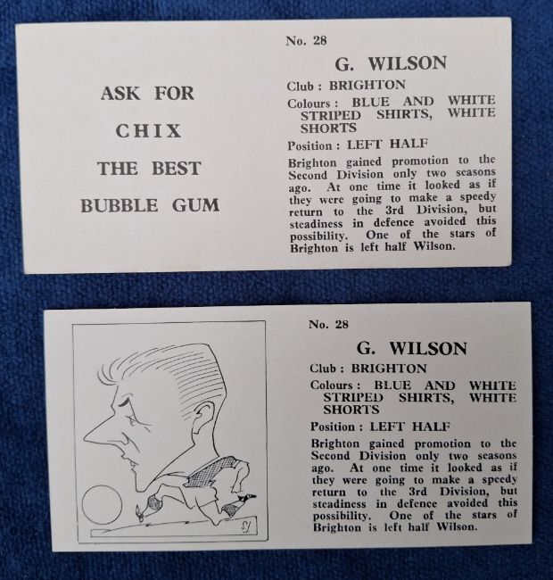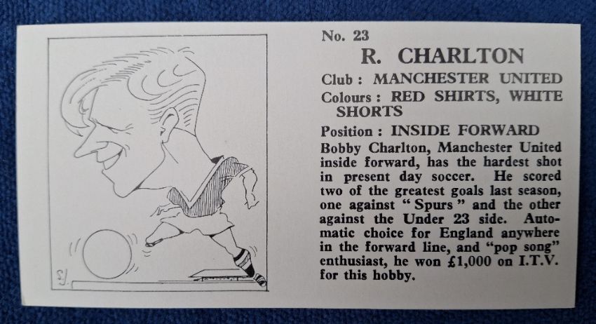 Trade cards, Football Chix Footballers Action & Portrait (set 48 cards) including Bobby Charlton plus alternative printing for number 28 with 'ask for Chix Bubble Gum' slogan on back instead of caricature (gen vg)