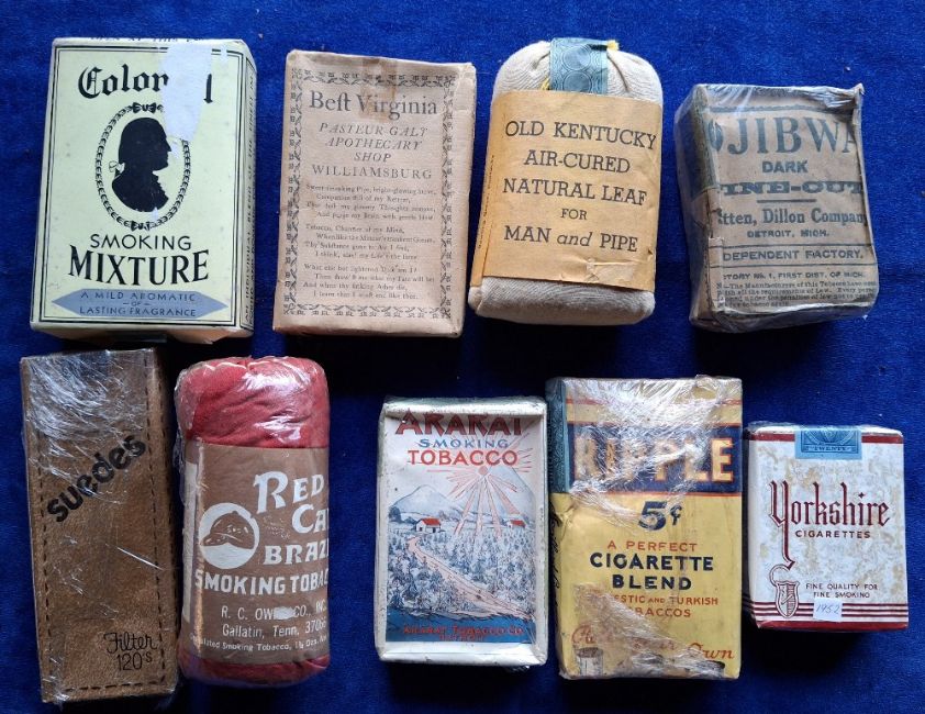 Tobacco Packets, USA etc, a collection of 35 live tobacco packets mainly 1940's/1950's but some earlier, mainly USA issues, most still with contents and many with original cellophane wrapping. Various brands & manufacturers including Troy Chewing Tobacco (Gail & Ax), Directors Special (Cannon & Waller), Ararat Tobacco Co (Detriot), Pan Patch, Buckthorn, Pep (Scotten, Dillon Co), Moore's Red Leaf Tobacco (Scott Tobacco Co) etc (gen gd, some have wear)