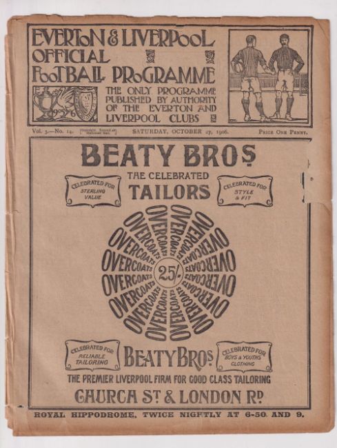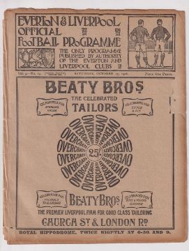 Football programme, combined issue for Liverpool v Manchester City 27 October 1906 & Everton Reserves v Bolton Wanderers Reserves played on the same date, ex-binder, (brittle, some paper loss and edge tears otherwise gd)