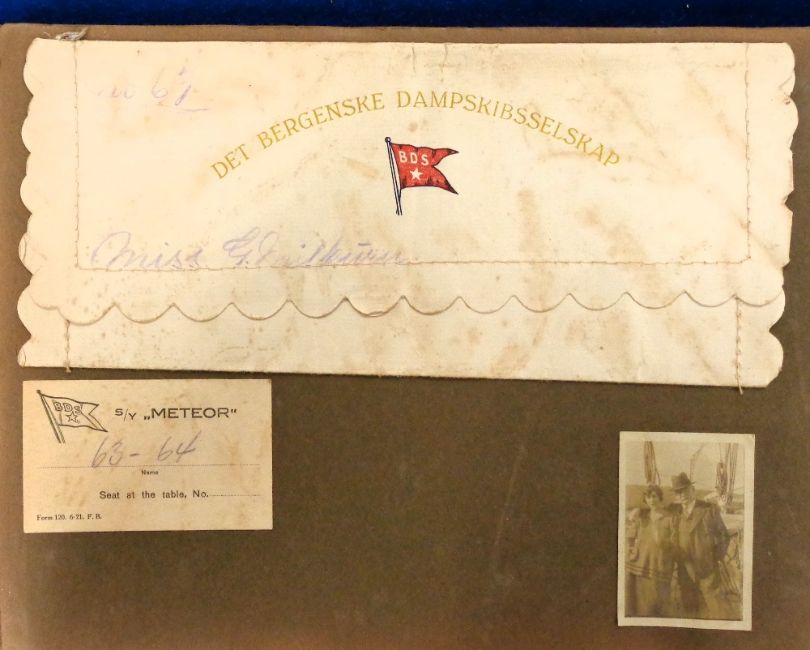 Shipping, Steam Yacht Meteor, 2 items to comprise a photograph album showing the voyage of the yacht sailing on 20th August 1921 including deck labels, photographs, postcards, passenger list, menus Thomas Cook passport forms etc. together with a 1921 photographic souvenir brochure (gd)