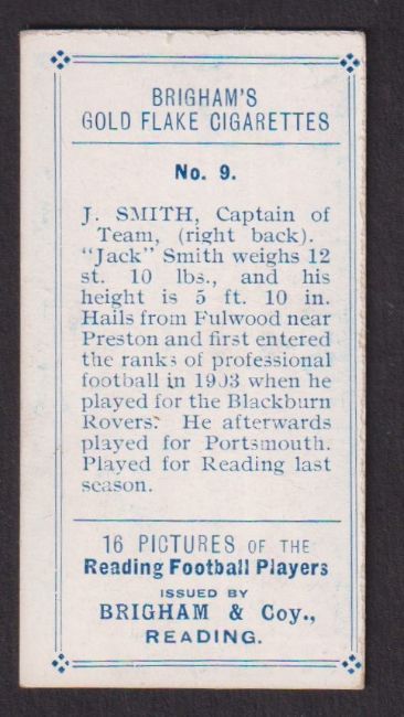 Cigarette card, Brigham, Reading, Reading Football Players, type card, no 9 J. Smith (back slightly off centre o/w gd) (1)
