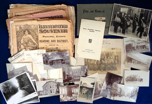 Ephemera, Reading, Berkshire, a large collection of items relating to the history of Reading and the Thames Valley to include a photo album presented to W A Scruton dated 1886, 1899 New Royal County Theatre poster, 10 copies of the Thames Illustrated circa 1900 inc. no 1, contemporary photographs and reproductions of earlier images, bill heads, postcards, souvenir books, 7 copies of 'Illustrated Souvenir Reading and District'. An interesting lot (mixed condition) (qty)
