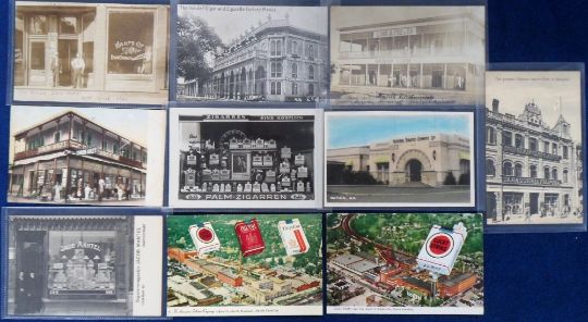 Tobacco advertising, a collection of 10 advertising postcards showing tobacco related shop fronts and factories from around the world inc. ATC Cigarette Plant, Durham North Carolina, Jacob Mantel Amsterdam, National Tobacco Co New Zealand, Louis A Pee & Co Honduras, etc (all unused, gen gd)
