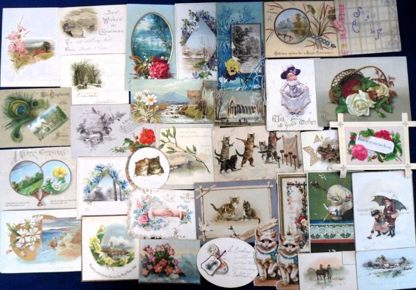 Vintage Greetings Cards, approx. 280 cards to include 1940/50s original artwork proofs, die-cut, glitter, deckle edged etc. Subjects include birds, children, a few anthropomorphic, flowers, pets and more (gen gd, adhesive marks to the reverse of most)
