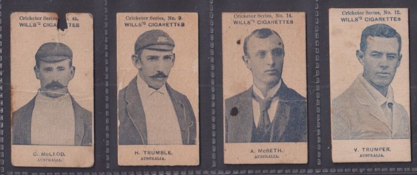 Cigarette cards, Cricket. Wills Australia, 14 cards from 2 early series. Cricketers Grey Scroll back fancy frame, 10 cards Duff, Gregory, Hill, CB Fry, Jones, Armstrong, Ranjitsinhji (trimmed), Trumble., Noble, Kelly plus 4 cards same seis without frame McLeod, Trumble (light creasing), McBeth, Trumper (trimmed) (all cards with faults, poor/fair)