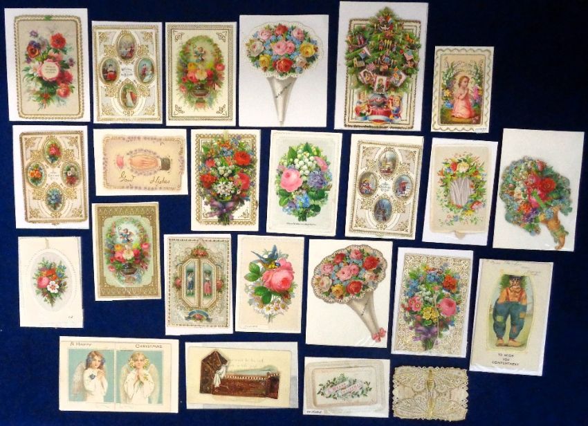 Greetings Cards, Movable, 26 Victorian cards with moving parts to include Christmas tree, dog cart, butterflies, flowers, angels, cradle etc. (gen gd, some with adhesive marks to reverse)