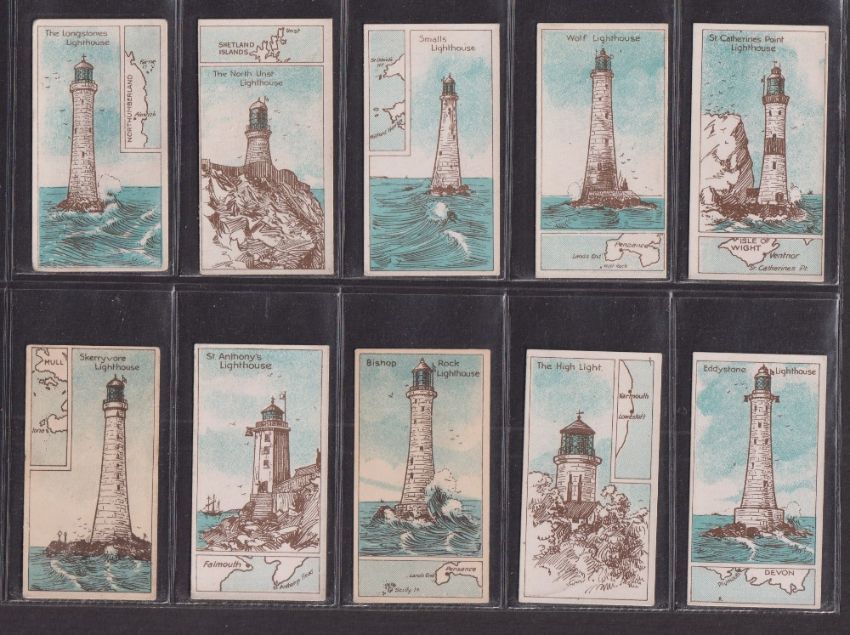 Cigarette cards, 90 better cards in small runs / part sets, Societe Job Lighthouses (15), Cope Dickens Gallery back listed (16), Robinson Wild Flowers (12), Clarke Royal Mail (30), Pattreiouex Dirt Track Riders (8), L & B Japanese series (3), Wills Seaside Resorts (6) (gen gd)