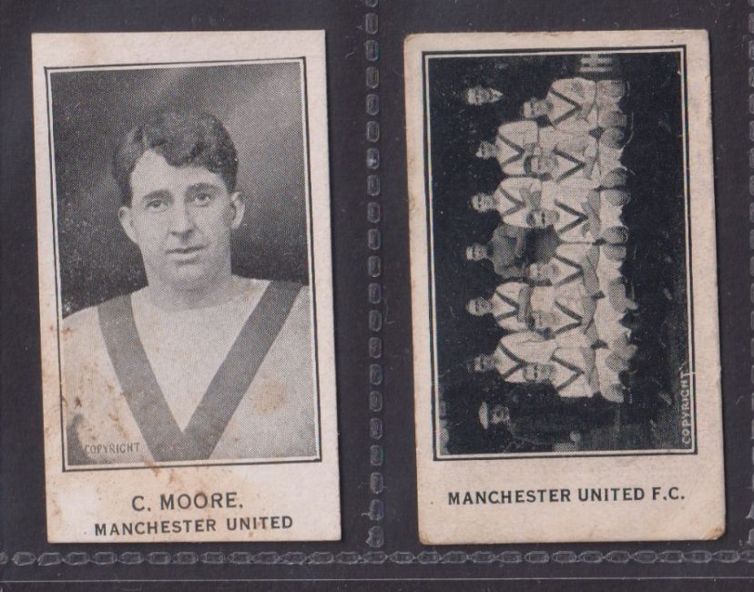 Trade cards, Barratt's, Cricketers, Footballers & Football Teams, Manchester United, two cards, C. Moore (slight mark to front) & Manchester United Teamgroup (some back damage & hinge mark) (2)