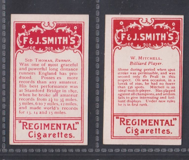 Cigarette cards, Smith's, Champions of Sport (Red backs), two cards, no 3, W. Mitchell (Billiard Player) & no 5 Sid Thomas (Runner) (both gd/vg) (2)
