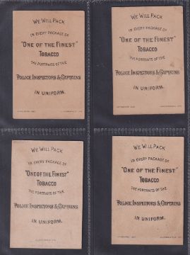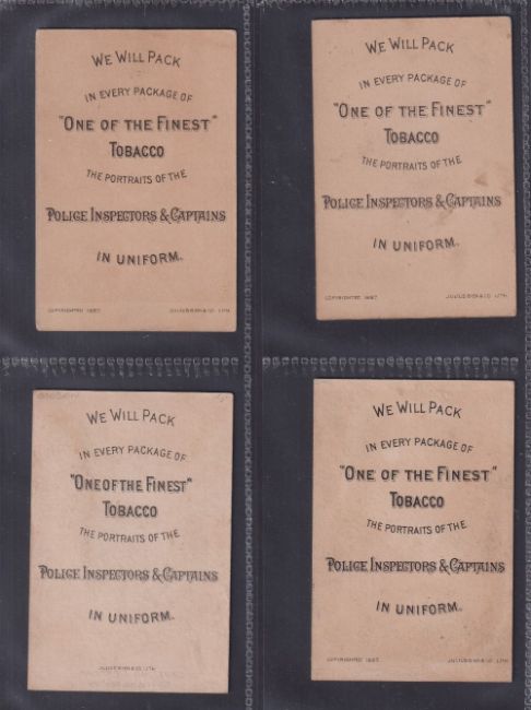 Cigarette cards, USA, Buchner, Police Inspectors & Captains (all with backs 'Police Inspectors & Captains in Uniform'), 'X' size, 4 cards, Capt. Anthony J. Allaire, Capt. Jno. J. Brogan, Thomas Byrnes & Capt. Edward Carpenter (all with slight age toning & slight marks, gen. gd) (4)