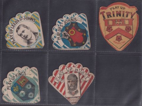 Trade cards, 5 shaped cards, three published by Baines, 'Play-Up Leeds St Johns' with Walton inset, 'Play-Up St Johns' (Oxon) & 'Play-Up Kings' (Camb), sold with two other shaped cards, Queen's Varieties Card for 'Play-Up Hurst' & Percy Priestlay of Millom 'Play-Up Trinity' (Cambridge) card (all with some faults, fair/gd). From the Phil Martin Collection.