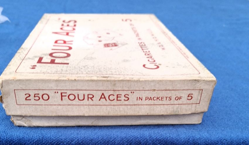 Cigarette live packs. Wills 4 Aces retail box with 40 live packets of 5 cigarettes (box originally contained 50 packets, so not quite complete). Packets and contents gd, box some wear and has inconsistent discolouration area on the top of the box