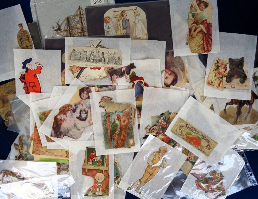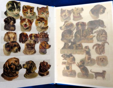Scraps, 3 albums of Georgian and Victorian scraps to include a selection neatly presented in a stamp stock book, 1 traditional scrap book and one self adhesive photograph album. Subjects include cats, dogs, poultry, children, Military, maps, Georgian engravings etc. Lot also contains many loose scraps. A good selection (gen gd) (many 100s)
