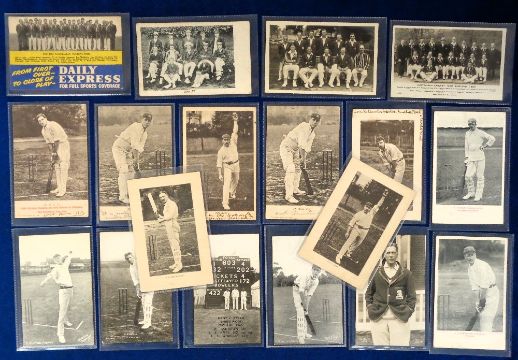 Postcards, Cricket, a selection of 18 cards inc. teams with 1956 Australian team advertising the Daily Express, Kent XI, Kent (RP), Australia team (1934 RP), players published by Wrench inc. John Gunn (Bowler), Maclaren (Bat), Clem Hill (Bat), Hayward (Bat), C.B Fry (Bat) plus 2 duplicates. Also F.E Woolley (Kent RP), Kent v Essex scoreboard 1934, Noble (Bat), Blythe (Bowler), Arnold (all rounder), Tyldesley (Bat Lancs) (gd)