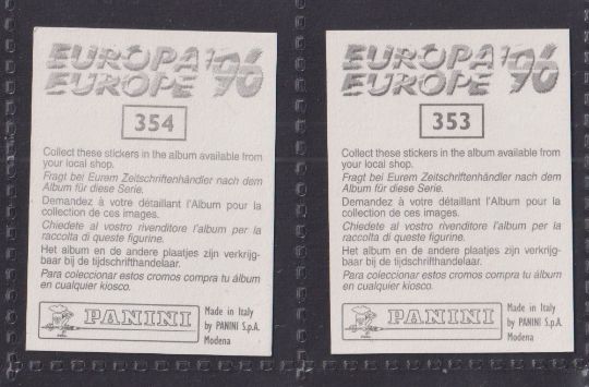 Trade stickers, Football, Panini Football Europe Europa 96 (set 354 stickers) with original backs, includes Zinedine Zidane, Denis Bergkamp, Luis Figo etc (gen vg/ex)