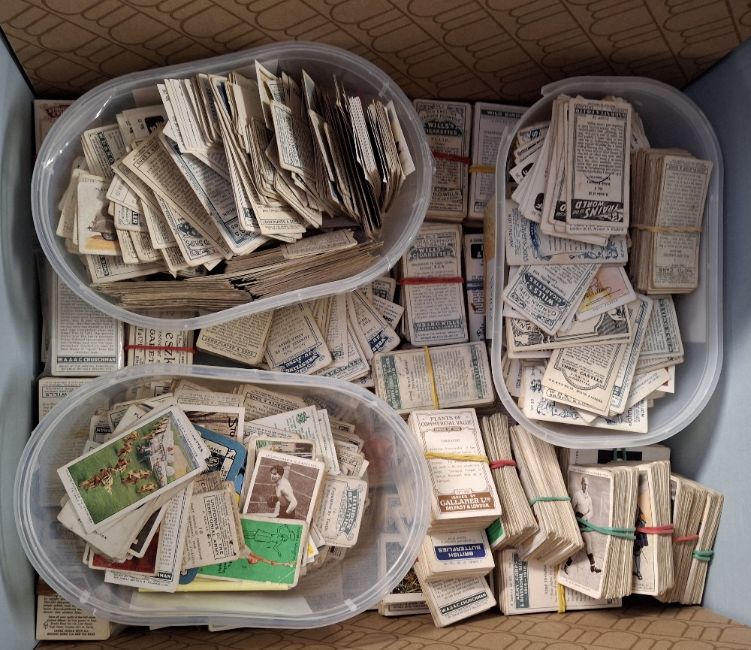 Cigarette cards, a very large collection of cigarette cards (a few trade cards) contained in 3 boxes. Mainly 1930's issues a few earlier ones noted. Presented in plastic sleeves (many of which have been sorted by issuer), a few period slip in albums, and some loose cards. Issuers noted include Ogden's, Gallaher, Godfrey Phillips, Player's Wills and many more (1000's) (mixed condition, many cards good or better)
