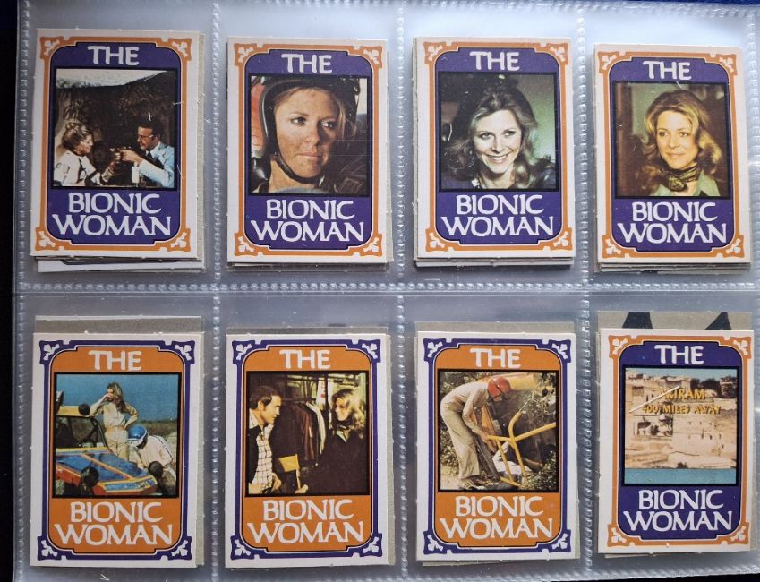 Trade cards, Selection in modern album, over 270 cards, plus a further approx. 1500 loose cards and stickers including Monty Gum part sets (approx. 150) including The Cops, Starsky Hutch Bionic Woman etc, Topps Saint & Greavsie (approx. 100), Merlin Stickers Comic Relief part set approx. 200, Panini 'School' (approx. 150), a few cards / stickers in unopened packets etc (gen gd)