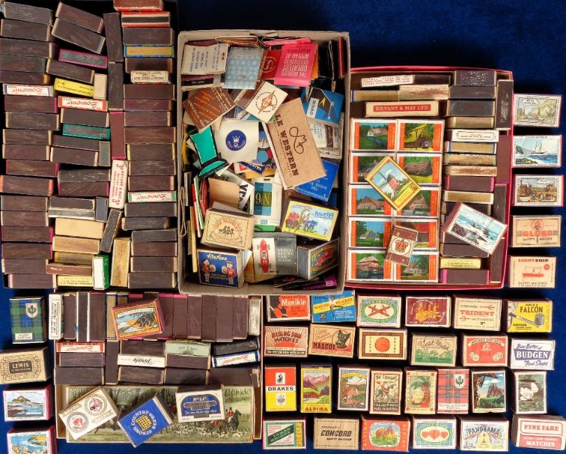 Match Boxes and Books, 300+ examples to include those made in India, UK, Holland, Austria, Italy, Spain, Belgium, Sweden etc. Labels include Capt Webb, Tulip, Monkey, Tamer Bridge, Tourist, St. Austell Brewery, Vita Mino, Boy Scouts, Three Hearts, Koks, Strong Country Beers, Cathay Hotel, Clock Brand, Halls Mentho-Lyptos, Falcon, Concord, Light Ship, Mascot, Manikin, Petite, Rising Sun, Panorama, Budgen, The Jungle Match, Trident, VeGe, Silver Blades, The Swords, Gloso, Test Match, Solo, Cheeta Fight, The Elephant, Drakes and many more (gen gd)