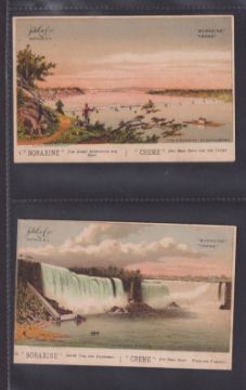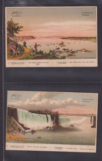 Trade cards, Early USA issue, 12 cards, Famous Painting series (7, all different issuers, 6 different fronts), Boraxine Crème, 3 plain back river views, Woolson Spice, 2 children cards (gen fair a few gd)