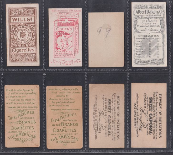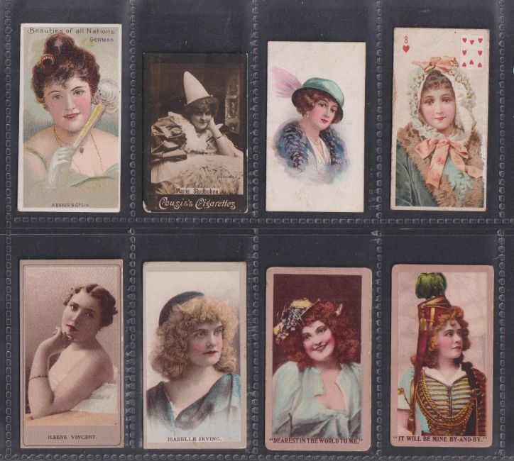 Cigarette cards, 8 x Beauties related cards including Kinney (2), ATC (2), Wills Beauties p/c (1), Ogdens Polo Picture hats, Cousis, Baker ( fair/mainly gd)
