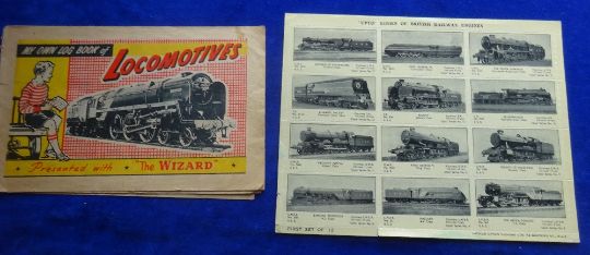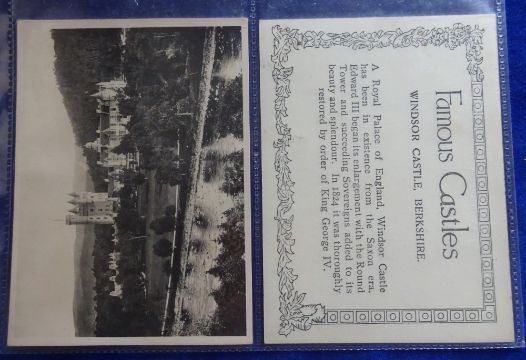 Trade & Cigarette cards, small mixture inclding 6 larger than postcard sized anonymous Famous Castles, Amalgamated Press Makes of Motor cars 10 cards, Skipper DC Thomson Capture the Rustler Puzzle card + envelope, Muratti Actress (trimmed), Raymond Revuebar type card, other type cards by Bewlay, Goodbody, Franklyn Davey, Wizard Log book of locomotives complete stuck down album (wear), Upto Series of British Railway Engines uncut block 12 cards etc (gen fair/gd many items gd)