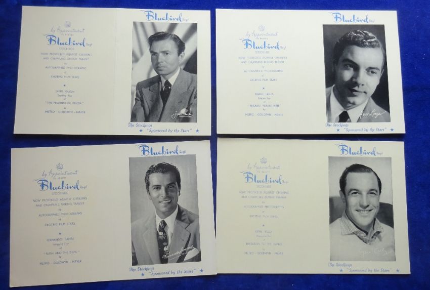 Trade cards, Film star related issues, including Bluebird Stockings Folders (14), Film Scenes anonymous (4), Bluebird postcard size issues (4 + 1 duplicate), Red Letter Pretty Girls (2), Womans Way 4 x premium size issues 1932 including Clarke Gable, Picture Show colured film scenes (2) ( gen gd a few fair)