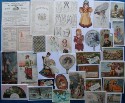 Advertising Cards, 70+ early cards to include Palmers Perfumes, Perry Davis Painkiller, Chocolat Suchard, Chocolat Lombart, Chocolat-Louit, Mother's Oats, Worcester Salt Co. (movable doll), Honiton Lace and much more. Many die-cut (gd)