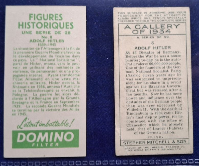 Cigarette cards, 24 cards, mostly all featuring Adolf Hitler. Mitchell Gallery of 1934 (creased), Muhlen Franck, Juwel, Kosmos, BAT Figures Historiques, plus 19 G Sized printed back unbranded German Tobacco issues (gen gd unless stated above)