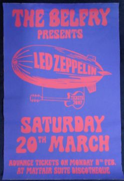 Music Poster, Led Zeppelin, original silk screen poster on thin paper stock for a concert held on 20th March, 1971 at The Belfrey, Birmingham, England. Approx. 75cm x 50cm (gd) (1). Extra provenance for this poster. A letter has been been provided by the vendor which will be included in the lot for the winning bidder. The contents of the letter are as follows 'The Led Zeppelin poster was created by my ex-partner and a collaborative who made posters using traditional screening in the late 1960's and early 1970's for the founders of the Mothers Club in Birmingham which after closing moved for a brief period to the Belfrey for which this poster is for'.